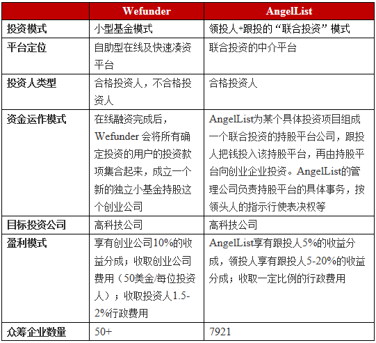 因此,从两者的商业模式来说,Wefunder的核心要素在于围绕普通人的投资需求进行产品设计、提供服务等;而AngelList的核心要素在于领头人或领投机构的发掘与管理,同时还将面临传统VC的竞争。