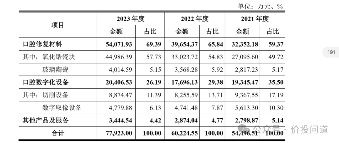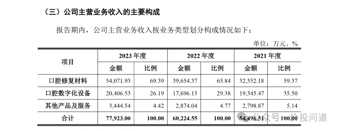 产品针对不同价位和需求,做了多个系列和品牌,设备也围绕牙科的业务流程做的方案设备提供。我们来看看它主营业务的收入构成: