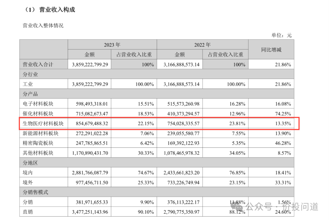 牙科材料在国瓷材料是其中一块业务,在其业务占比22%,营业收入8.5亿,目前也是材料板块中占比较高,且增长13%。
