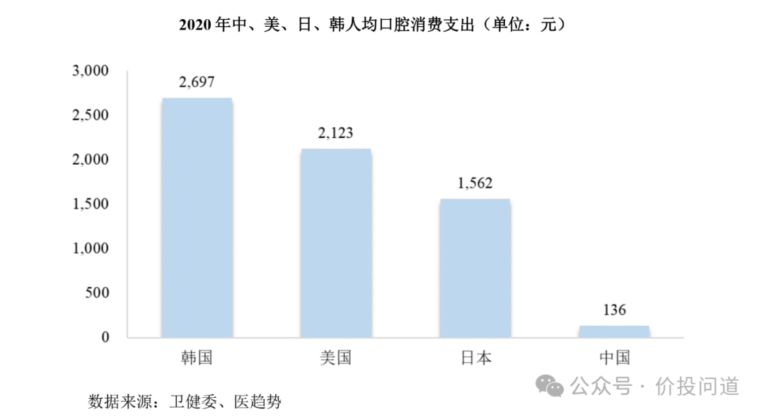与发达国家相比,我国口腔医疗市场规模仍有较大上升空间。参考美国、日本、韩国的齿科消费情况,我国人均口腔消费支出与发达国家仍有较大差距。 2020 年,美国、日本、韩国的人均口腔消费均超过1,500 元人民币,而我国人均口腔消费仅为 136 元,远低于发达国家人均口腔消费水平。