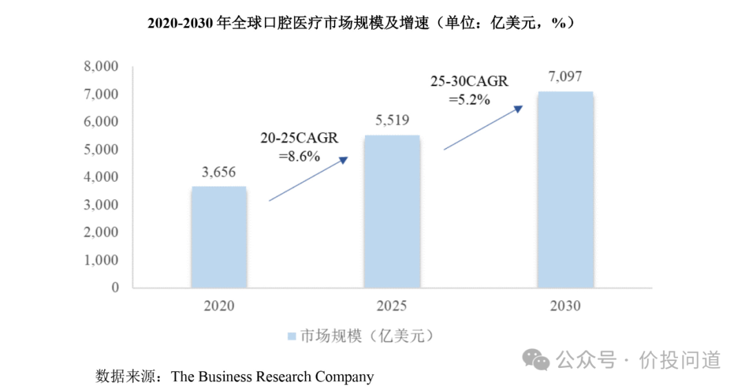 2020年全球口腔医疗市场规模达到 3,656 亿美元。随着老龄化进程加速,预计 2020年-2025年全球口腔医疗市场将以 8.6%的复合增速增长,至2025年全球市场规模将达到约 5,519 亿美元;伴随齿科美容需求的不断上升、民营口腔诊所的日益普及和口腔技术的进步,预计 2025年-2030 年全球口腔医疗市场将以 5.2%的复合增速增长,至2030年全球市场规模将达到约 7,097亿美元。