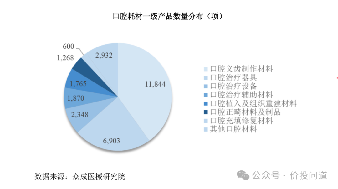 截至 2024 年 2 月 20 日,全国口腔耗材领域有效注册产品共计 29,530件。 从一级产品数量分布来看,口腔义齿制作材料产品数量为 11,844 项,占比40.1%,位列第一。