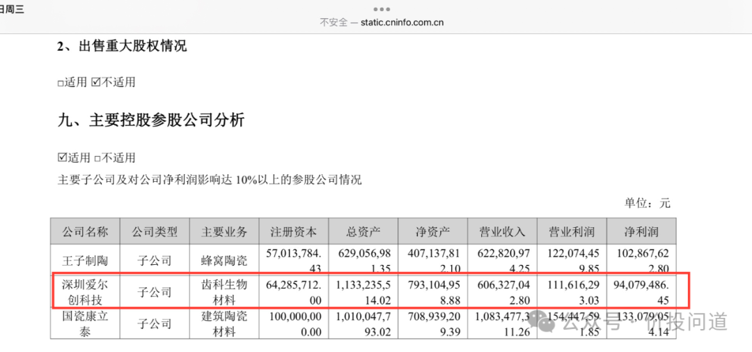 这是国瓷材料的财报披露。爱尔创营业收入为6亿,利润为9407万。