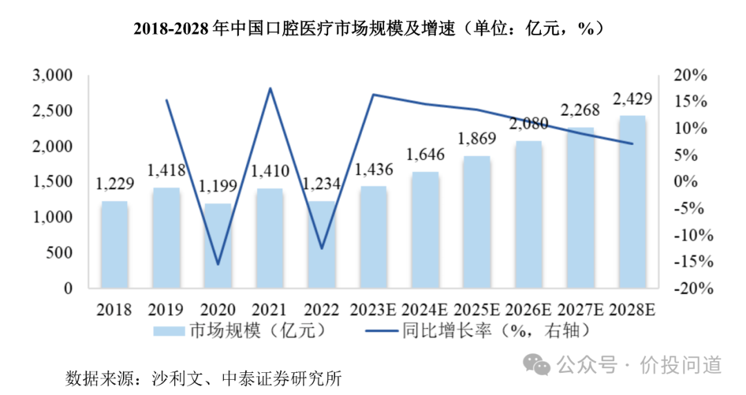 中国口腔医疗市场处于高速增长的阶段。 2018年-2028年,我国口腔医疗行业市场规模从1,229 亿元预计将增长至 2,429 亿元,复合增速为 7.1 %。