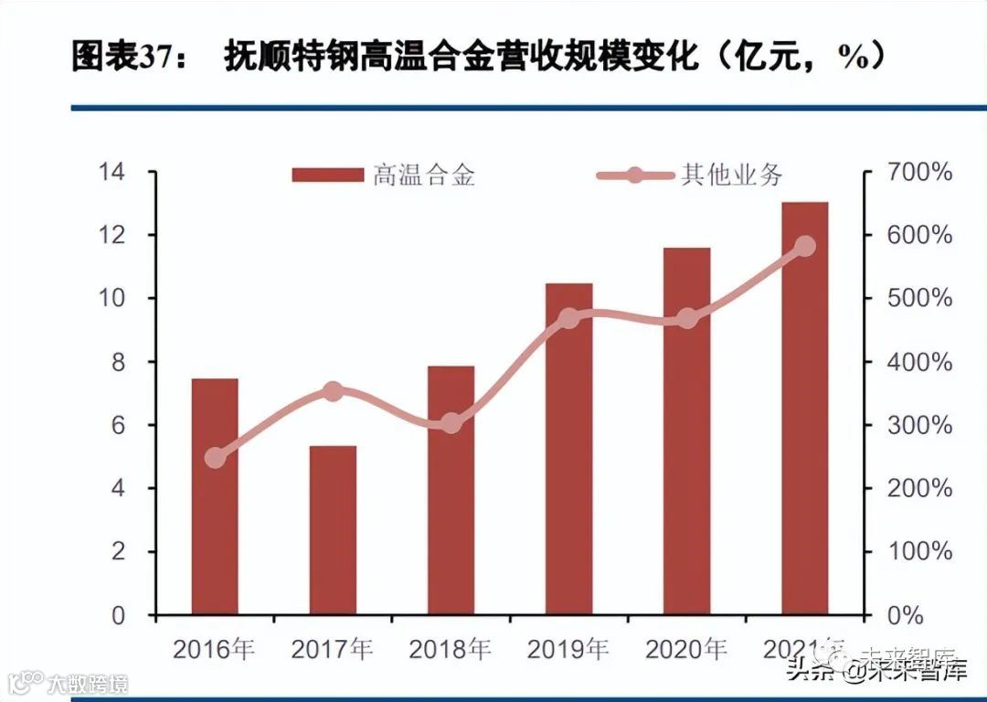 抚顺特钢始建于 1937 年,拥有高温合金、超高强度钢、特冶不锈钢、高档工模具钢四大主打产品,产品广 泛服务于航空航天、国防军工、能源电力、石油化工、交通运输、机械机电、环保节能等六大领域,是国内重 要的特殊钢新材料供应商之一。公司产品在国防军工行业长期处于龙头位置,高温合金、新型不锈钢、超高强 度钢等航空航天领域用的尖端材料,在产量规模上位居前列,市场占有率达到 60%,其中高温合金及超强钢在 军用领域市占率约 80%左右。公司高温合金及超高强度钢特冶工艺具有极高的经验壁垒及产能优势,几乎垄断配套我国军用高端特钢需 求,处于核心放量卡位。连续的技改扩产有望有效承接行业景气,转化为利润增长。领先的冶炼合格率及冶炼 效率,新牌号的联合试产奠定公司坚固的护城河。公司短期原材料涨价承压。公司 21 年高温合金业务营收 13.04 亿元,同增 12.41%,毛利率同增 2.3pcts 至 42.65%。21 年,高温合金产 量 5894 吨,销量 6049 吨,设计产能约 6000 吨,产能成为业绩增长的主要制约,公司目前正进行新产能扩建及 老产能技改,预计可新增约 5000 吨产能,将在需求端持续景气情况下有效转化为业绩支撑。