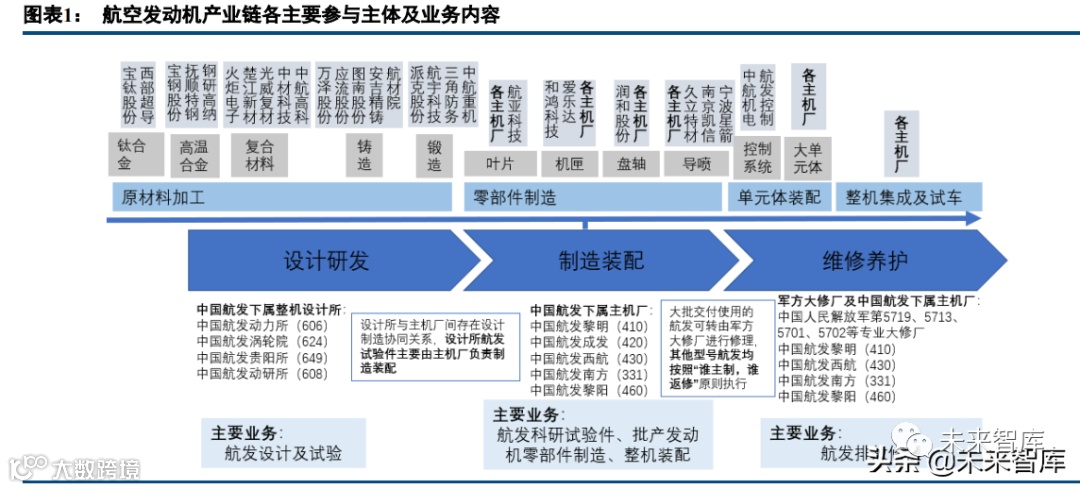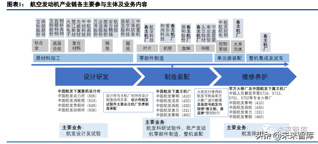 我国航空发动机板块主要由国家布局产业结构及规模的先进制造产业集群组成。在改革开放前,军用航空 发动机产业配套几乎完全由航空发动机主机厂及相关专业成附件、原材料厂垄断,由科工局及航空工业集团直 接管理,由于军工独特的保密及质控要求,航发产业链呈现高度的封闭性及排他性。改革开放后,随着军民融合的逐渐推广并上升为国家战略,民营企业研发技术及经营效率优势逐渐体现, 航空发动机产业链从上游开始逐渐对民营企业打开,在部分新材料新工艺领域,民营企业呈现差异化垄断优势。航空航发体制内相关主机厂及专业厂受限于编制及规模扩张的制度性约束,在保障总装总试及关重(关键 重要)零部件加工的核心业务产能的前提下,加快将非核心、不具备技术和规模优势的业务外委实施,使产业 链中上游的体制外企业充分受益。航发集团“小核心、大协作”的生产研制模式给航发产业链整体的结构优化 及规模提升带来了巨大的机会。