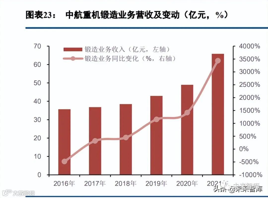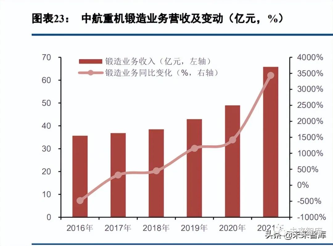 公司隶属于中国航空工业集团,集成我国主要的国有航空锻件生产企业,下属锻造专业化企业包括宏远公 司、安大公司及景航公司,其中宏远公司主要从事飞机大中型锻件研制生产、安大公司主要从事航空发动机盘 轴及环锻件研制生产,景航公司主要从事飞机中小型精密锻件研制生产。中航重机作为航空工业集团下属专业锻造企业集成平台,其产业布局和发展与我国航空装备研制升级过程 高度耦合,具有极大的先入时效及产业卡位优势。公司目前开展的航空锻造大型化、精密化技改,将扩大公司 在高端航空锻件中的市场份额,强化公司的龙头地位。同时,公司凭借其航空锻件龙头地位及较多的战略物资 储备,在原材料涨价的背景下有较大的议价空间。公司 16-21 年营收稳定增长。17 年分拆新能源业务后,锻件业务营收占比维持在 70%以上,且 18-21 年持 续增长,锻造业务营收同增 34.34%。航空锻件贡献公司主要营收,锻件业务中航空领域占比维持在 80%以上。随着锻件业务规模的扩大,对设备及模具等固定投资的摊薄效应更加明显,锻件业务毛利率持续升高,达到 28.92%。随 2018 年定增产能逐渐完全达产及 2021 年定增新增产能接续,公司的锻件业务规模有望再上台阶。