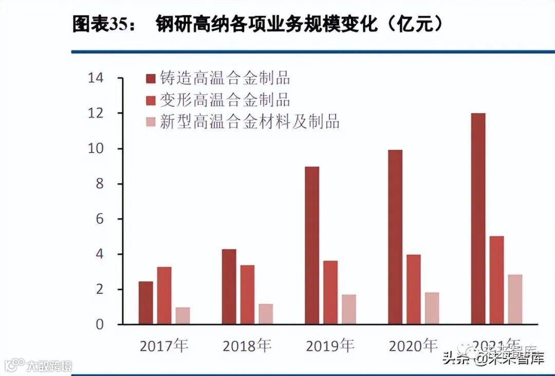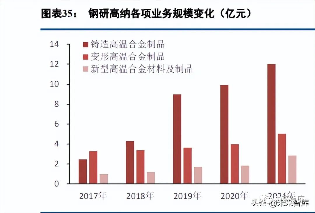 19 年后收购青岛新力通叠加航空航天铸件快速起量,铸造高温合金业务逐渐超过原主业变形业务, 21 年 公司铸造高温合金营收同增 20.78%,其中民品约 5.7 亿元(+8.26%),军品约 6.4 亿元(+34.71%),整体铸造高 温合金毛利率大幅降低 10.13pcts 至 24.45%,或为平度基地新产能在年中投用,折旧摊销较大,公司“多品种、 小批量”的产品结构及部分类型铸件原材料涨价有关;变形高温合金业务以军用为主,同增 26.44%,增速较慢 主要是公司的变形高温合金主要工序均外委实施,受 21 年主要产能紧张的影响,变形业务增长率有限,同时变 形高温合金毛利率下降 7.18pcts 至 21.34%;公司新型高温合金业务则具有极大的技术优势,呈现集中放量趋势, 同增 54.36%,同时新型高温合金为先进航发及燃机发展趋势,毛利率增长 7.64pcts 至 54.94%。公司积极扩展产能,逐渐实现从科研小批向批量规模交付的转变,全面扩张铸造及变形业务。19 年,公司 青岛平度产业基地开始建设,主要生产航空航天用高温合金无余量精密成型件,铝、镁、钛等航空航天用轻质 合金精密成型件等,提升国际宇航业务交付能力、布局高温合金领域内的先进材料;21 年,公司将铸造高温 合金制品事业部划转至公司控股子公司河北钢研德凯科技有限公司,实现铸造业务整合;同年,公司拟在德阳 建设两机用高端金属盘锻件产业基地项目及钢研高纳-四川华腾航空航天环轧中试基地,进一步扩展变形高温合 金业务规模。20 年,钢研高纳设立常州钢研,航发资产入股,扩展激光选区熔化等金属增材制造技术,从事高 温合金、钛合金、铝合金、不锈钢、模具钢等高端金属材料的复杂形状零部件制造。
