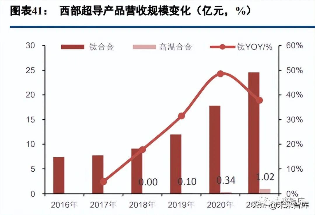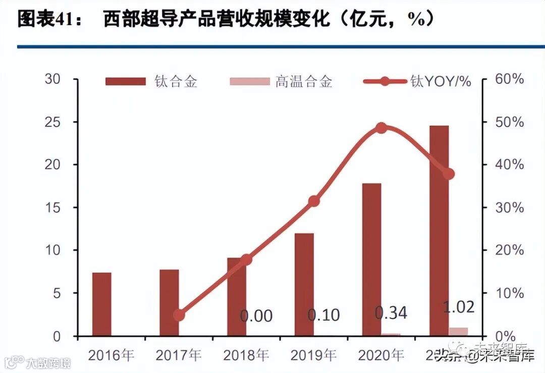 西部超导具有航空航天用金属结构材料超纯净、高稳定冶炼的技术优势,生产的高端钛合金棒丝材为我国 新型战机、运输机核心结构件主干材料。公司是目前国内唯一实现低温超导线材商业化生产的企业,也是目前 国际上唯一的铌钛(NbTi)锭棒及线材全流程生产企业,主要应用于下游磁共振成像(MRI)、磁控直拉单晶硅 (MCZ)及核聚变堆科研项目。公司延伸航空钛合金冶炼的技术经验优势,逐渐布局发动机用高性能高温合金 材料,目前多牌号高温合金牌号已进入主要客户验证阶段。公司作为航空航天用高端钛合金棒丝材的主供应商,大规格毛坯纯净化、均匀化控制技术优势突出,钛合 金跟随下游新型战机及运输机结构用材核心放量,逐渐布局航发冷端部件需求,有望成为高价值业务增量。高 温合金延伸公司的冶炼加工技术优势,实现新牌号生产的后发先至,弥补我国主要高温航材的进口依赖,目前 主要处于下游验证阶段。
