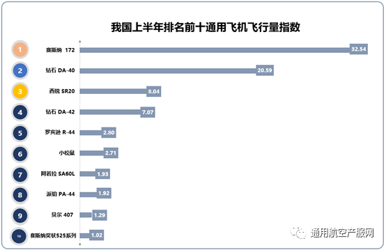 截至2022年6月底,依据星越通用航空大数据平台统计,我国上半年通航飞行量指数排名第一的机型是赛斯纳-172,赛斯纳172简称C172,是赛斯纳飞机公司的经典机型,它是4座单发活赛发动机轻型螺旋桨飞机,在全球的销售量超过43,000架,是世界上最成功的生产量最大的轻型通用飞机。