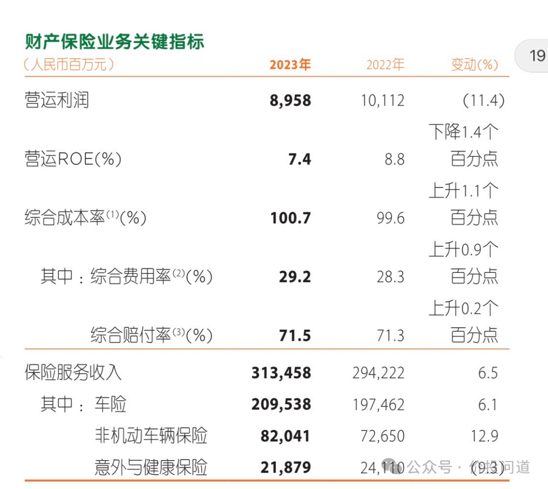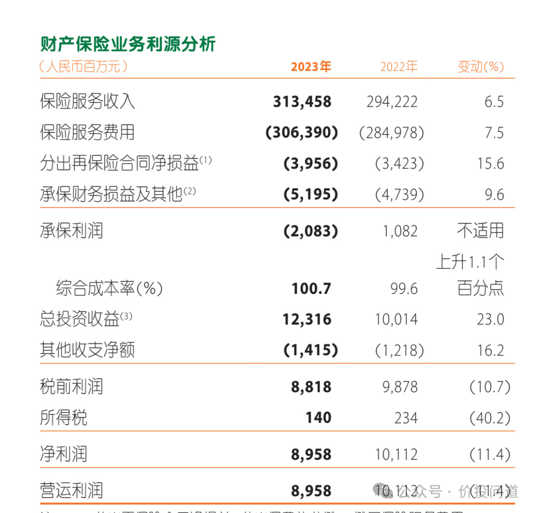 净利润2023年89亿,同比2022年下降11.4 %,产险如果不是投资收益赚了123亿,也很危险。