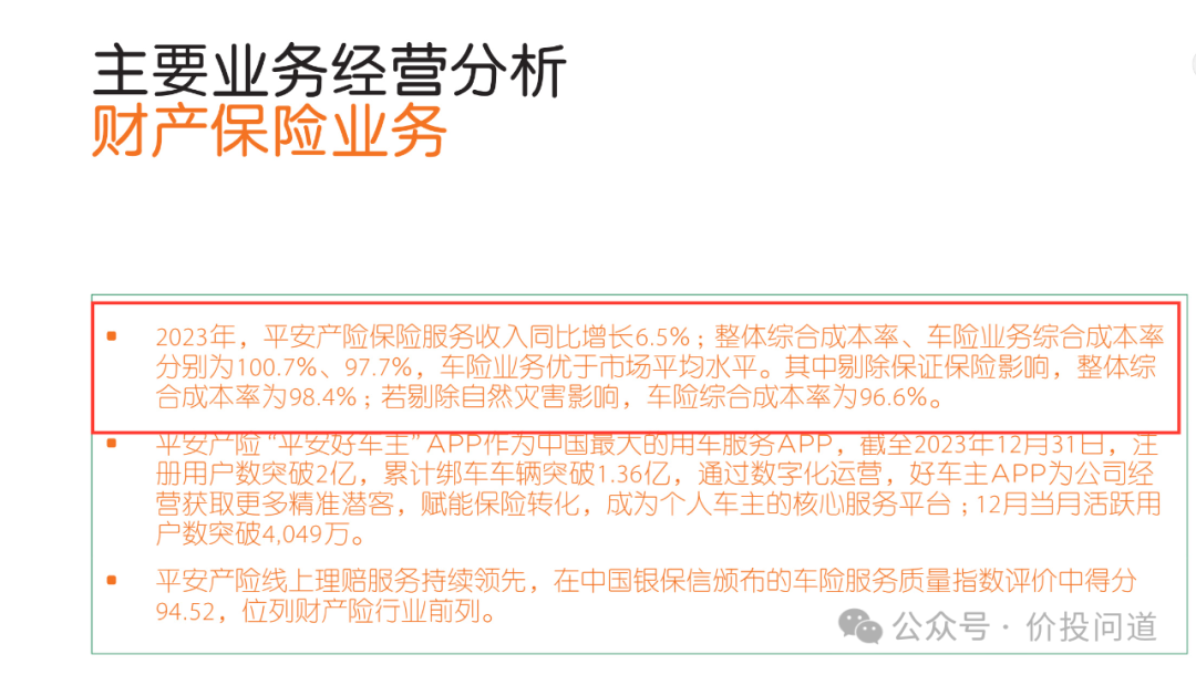 一般来说,会拿到主要业务经营分析这个框里面的,都是能拿来提振信心的,我通常会挑些和业务关联度高的看看。这里提到平安产险保险服务收入同比增长6.5 %;整体综合成本率、车险业务综合成本率分别为100.7 %、97.7 %,车险业务优于市场平均水平。其中剔除保证保险影响,整体综合成本率为98.4 %;若剔除自然灾害影响,车险综合成本率为96.6 %。