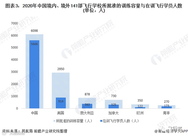 具体来看,2020年,我国境内141部飞行学校所批准的训练容量达6098人,在训飞行学员人数达5606人。美国所批准的训练容量达2950人,在训飞行学员人数仅为914人。澳大利亚、加拿大、欧洲、南非在训飞行学员数量则较少。