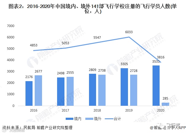 从境内、境外141部飞行学校注册的飞行学员人数上看,2016-2020年,境内141部飞行学校注册的飞行学员数量逐年上升,2020年达3531人;2016-2019年,境外141部飞行学校注册的飞行学员数量整体上升,但增速明显小于境内,2020年,受疫情影响,数量明显下降,飞行学员数量仅为285人。