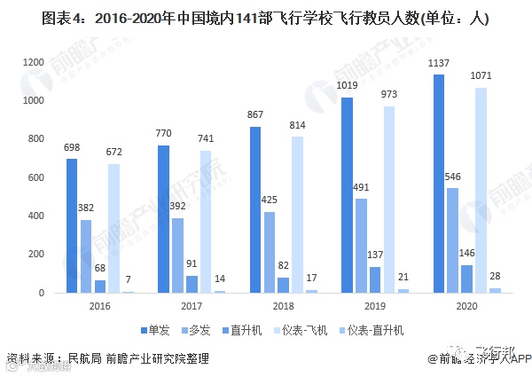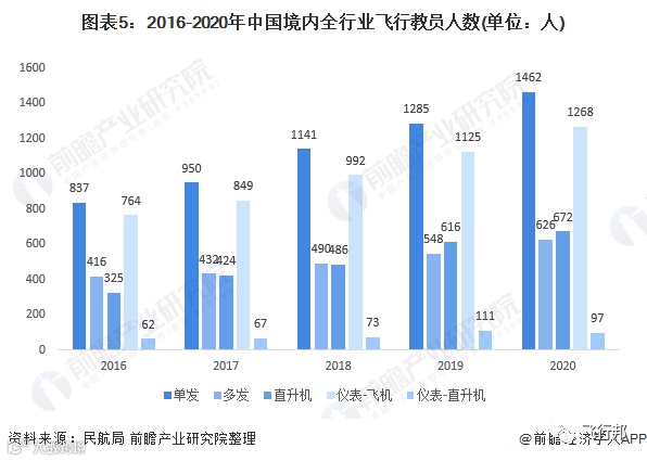 从境内全行业飞行教员数量上看,2020年全行业共有2143人持有有效基础教员等级或仪表教员等级,其中1462人持有飞机单发基础教员等级,626人持有飞机多发基础教员等级,672人持有直升机基础教员等级,1268人持有仪表-飞机仪表教员等级,97人持有仪表-直升机仪表教员等级。