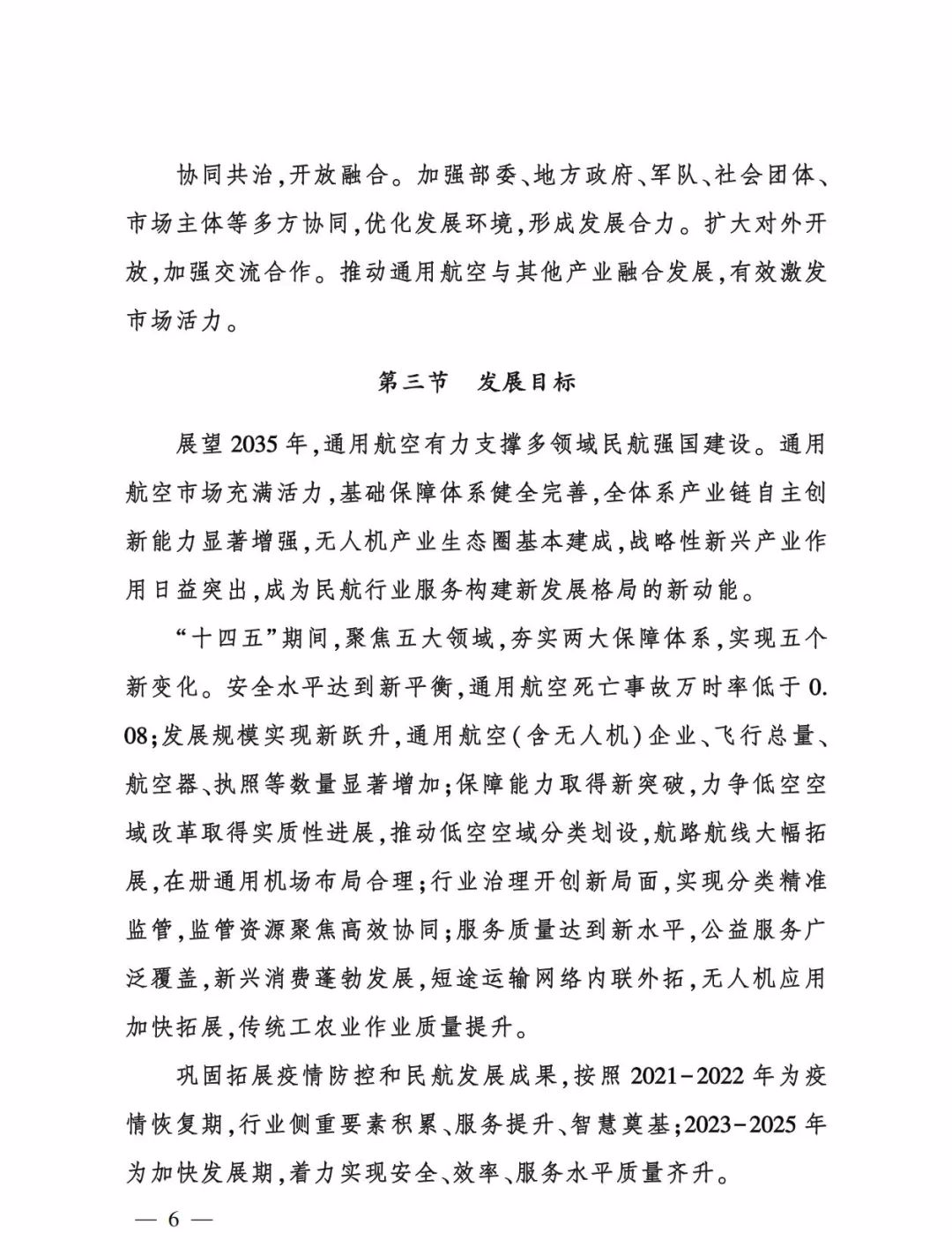 “十四五”期间,聚焦五大领域,夯实两大保障体系,实现五个 新变化。安全水平达到新平衡,通用航空死亡事故万时率低于0.08;发展规模实现新跃升,通用航空( 含无人机) 企业、飞行总量、 航空器、执照等数量显著增加;保障能力取得新突破,力争低空空域改革取得实质性进展,推动低空空域分类划设,航路航线大幅拓 展,在册通用机场布局合理;行业治理开创新局面,实现分类精准 监管,监管资源聚焦高效协同;服务质量达到新水平,公益服务广 泛覆盖,新兴消费蓬勃发展,短途运输网络内联外拓,无人机应用 加快拓展,传统工农业作业质量提升。
