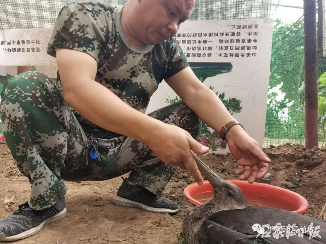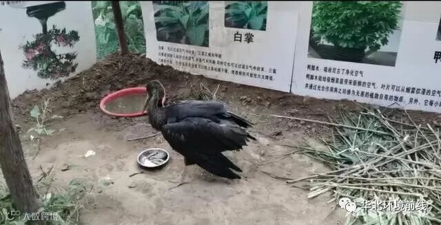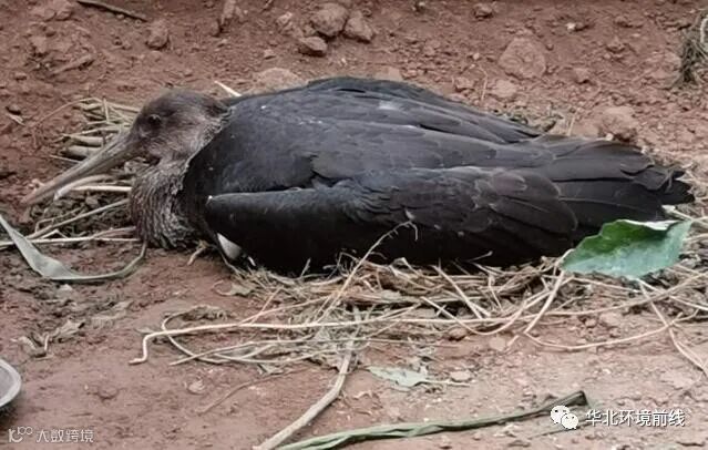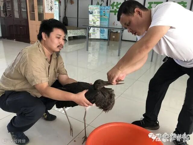 7月24日12时许,让候鸟飞伙伴华北环境前线负责人高琼和记者第一次见到小黑鹳。经检查发现,牠的右翅膀有陈旧性骨折。小黑鹳的头无力地下垂,倒在地上,已经奄奄一息。
