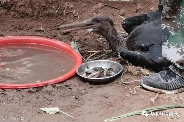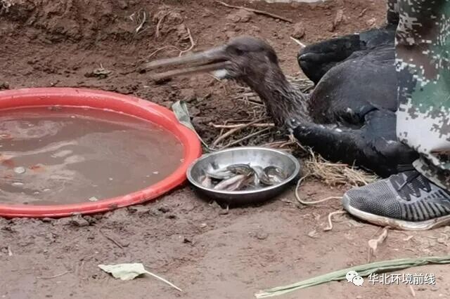 当时,小黑鹳看到小鱼很想吃,可由于太过虚弱,头都抬不起来,靠人抱到水盆前,就算咬住了鱼也无力吞咽。在救护员的帮助下,小黑鹳吃了几条泥鳅和小鱼,可不久就吐了。