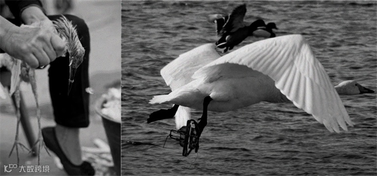图2右、一只带着兽夹,艰难飞行的天鹅。摄影:陈晓东