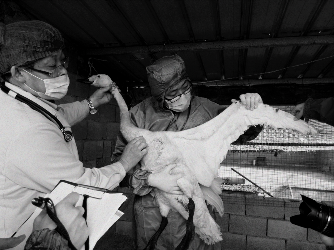 图3、2014年3月,济宁候鸟非法收购窝点曝光,图为鸟医志愿者前来为罚没鸟类做检查。