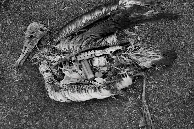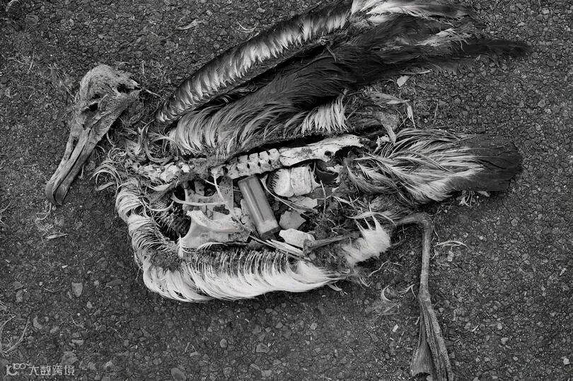 图4、吃了塑料垃圾的信天翁的的残骸。摄影:美国摄影师克里斯. 乔丹