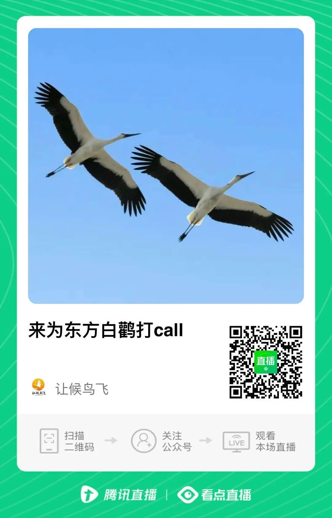 今年渤海湾天津段迁徙路线保卫战即将打响。欢迎大家扫码预定候鸟直播间,一起来看让候鸟飞执行长刘慧莉连线天津滨海疆北湿地保护中心负责人王建民老师,讲述东方白鹳保卫战的故事。