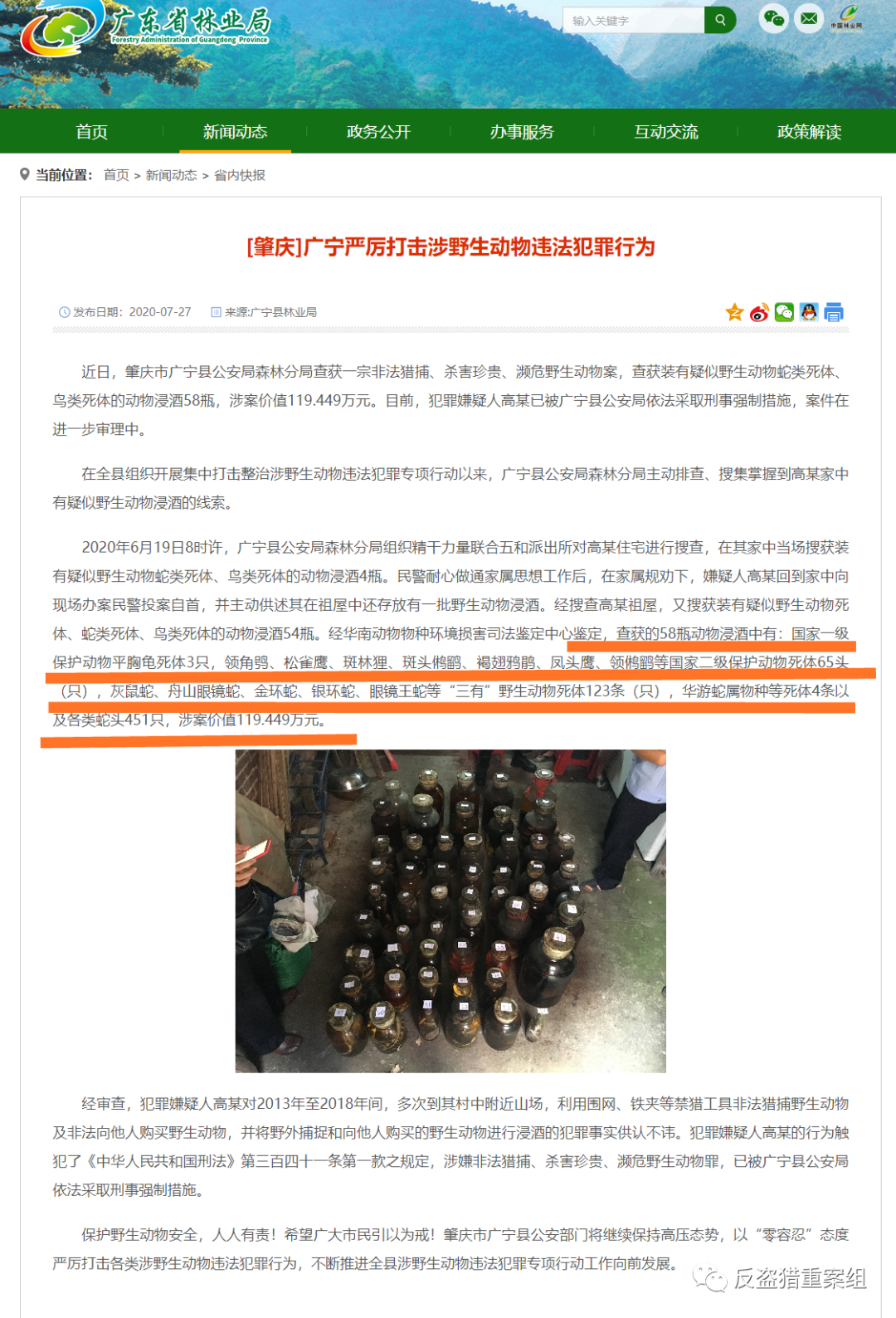 近日,广东肇庆广宁县公安局森林分局侦破了一起非法猎捕、杀害珍贵、濒危野生动物案,查获58瓶“野生动物酒”。涉案包括国家一级保护野生动物平胸龟3只,国家二级保护野生动物领角鸮、松雀鹰、斑林狸、斑头鸺鹠、褐翅鸦鹃、凤头鹰、领鸺鹠等65只,三有保护野生动物灰鼠蛇、舟山眼镜蛇、金环蛇、银环蛇、眼镜王蛇等123条,另有各类蛇头451只!详情:肇庆 | 广宁严厉打击涉野生动物违法犯罪行为