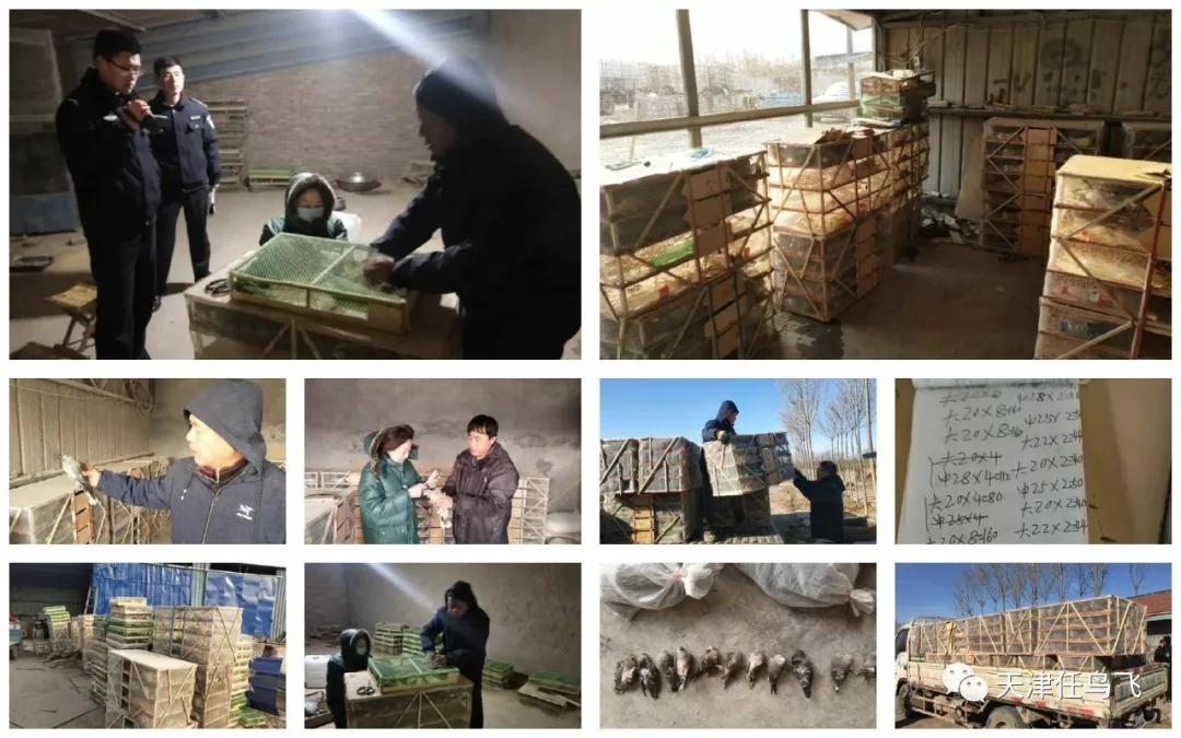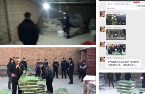 2019年初,天津护鸟志愿者接到山东志愿者举报,称发现一处非法贩卖、收购野生鸟类窝点。随即驱车行驶300多公里来到山东省济阳,经过对黑窝点的暗访并掌握了初步线索后向当地森林公安执法部门举报。森林公安和志愿者通力合作,当场查获麻雀、斑鸠活体数千只,以及冰柜里藏匿的各类死体若干只,放飞野鸟4000余只,斩断了一条 捕捉、收购、贩卖、生产、加工、运输一条龙的罪恶链条,打响了新年的第一枪。