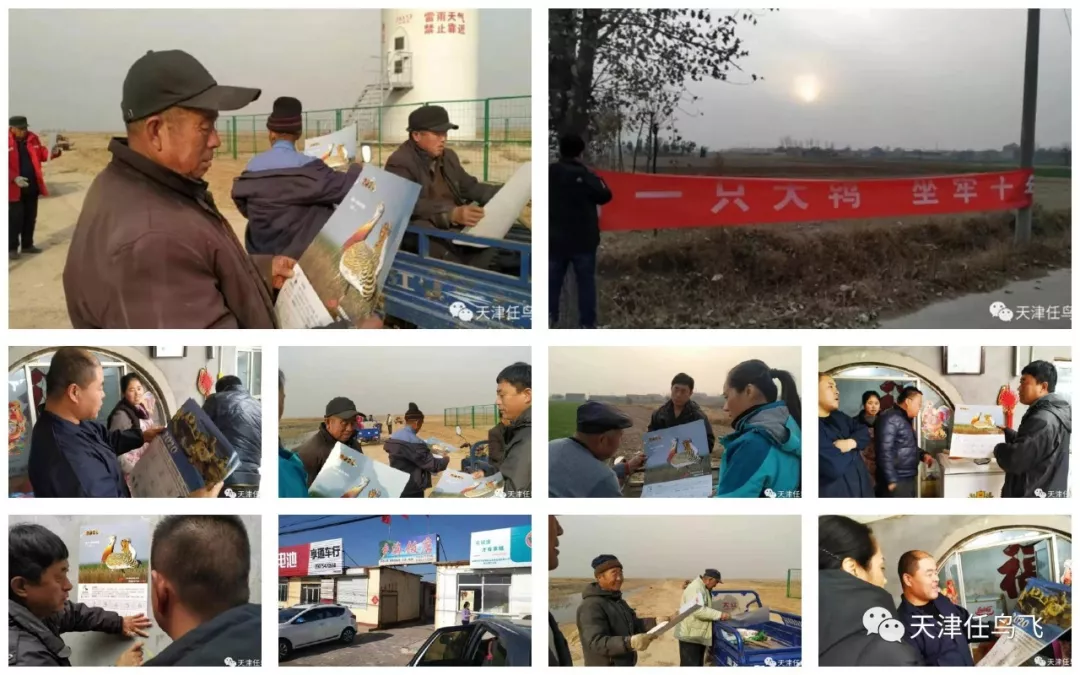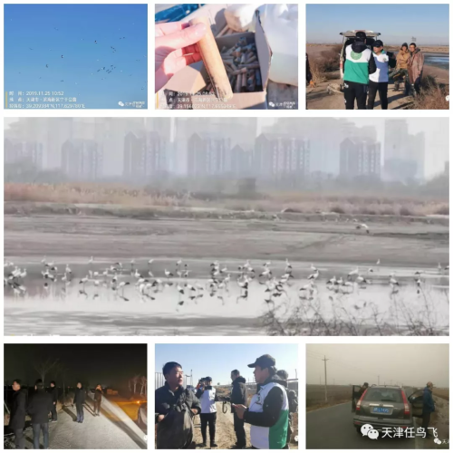 2019年,天津护鸟志愿者团队采取365天不间断巡护的方式,分成两个战斗小组,持续做好防盗猎巡护工作。深入宁河、武清、北辰、静海、西青、东丽、津南、宝坻、蓟州、滨海新区等区县进行全覆盖巡查,拆除果园鸟网近百余张,发放驱鸟带2000余个,开展普法宣传人次达5000余人,发放普法宣传单5000余份,救助鸟类30000余只,行程60000多公里,并深入河北唐山、沧州、山东等地区,协助当地志愿者协会进行候鸟保护工作,持续探索“京津冀”一体化模式。