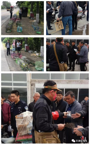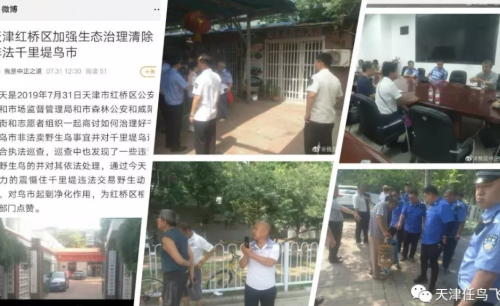 天津市公安局,河北区公安局,市森林公安局,综合执法联合天津护鸟志愿者连续三天对建昌道鸟市进行查处违法贩卖鸟类案件,有力打击了非法贩卖行为。