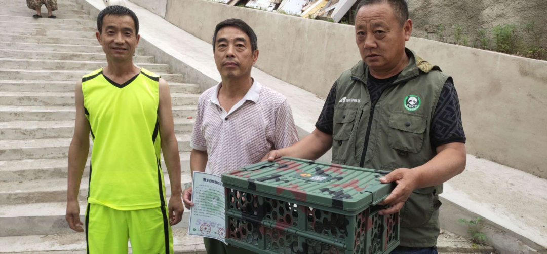 爱心市民张先生(中间)和志愿者海陆空(右一)。感谢“远图”的户外折叠箱品牌,为让候鸟飞的全国志愿者捐赠车载折叠箱,用于病伤鸟类的转运。