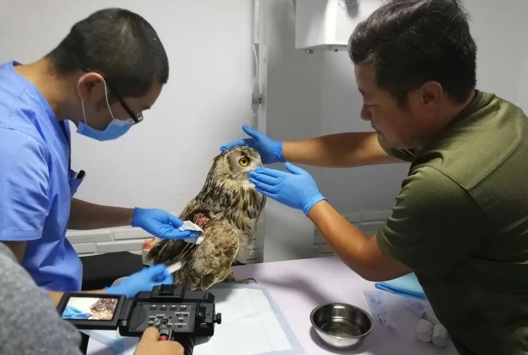 “手术难度比较大,术后休养也很重要,我会尽全力完成的。”张拥军医生结合20多年的临床经验,为在场的技术人员讲解手术要领。手术期间,记者进入手术室,看到双龙一边给张医生做助手,一边用蒙语安抚雕鸮。