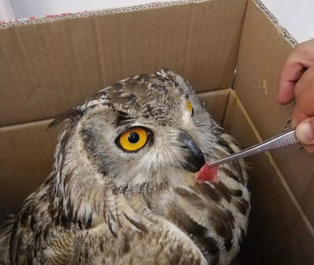 2018年双龙救助挂在围栏上的雕鸮,伤口生蛆,经过数月救助,2019年4月痊愈,重返蓝天。