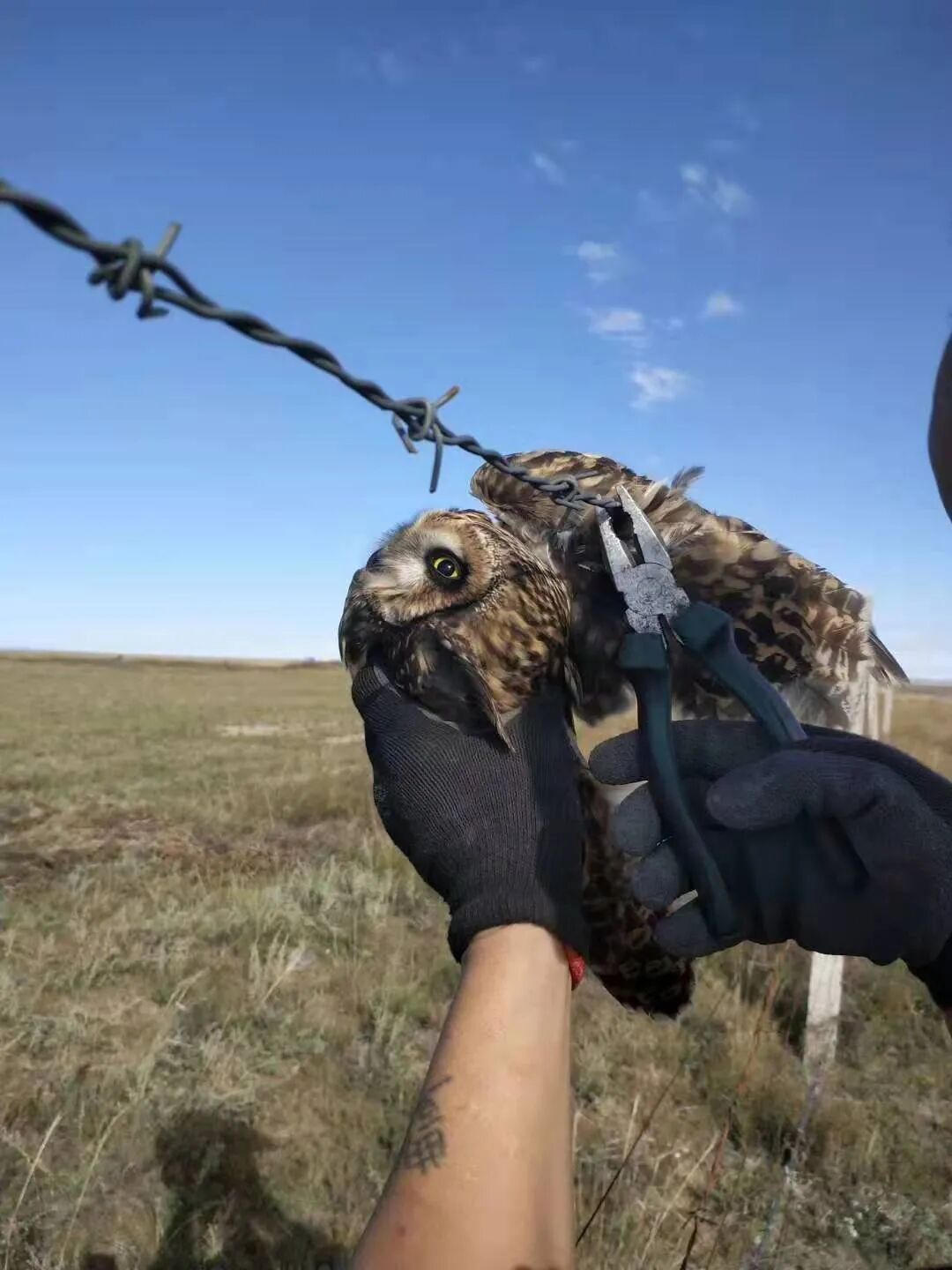 2018年8月5日,一名群众在新右旗草原的网围栏上发现了一只奄奄一息的大鸟,小心翼翼地从网围栏上摘下它后,送到了旗所在地阿拉坦额莫勒镇兽医站,并且通知了当地的林业公安部门。