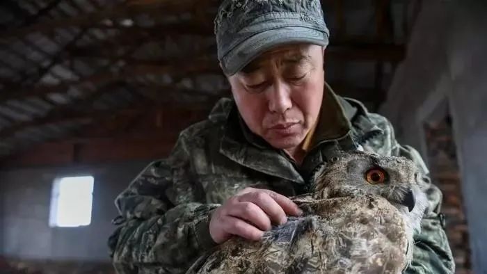 在照顾雕鸮时,双龙像对待孩子一样对待它,喂水,喂肉时,总会用蒙语呢喃安抚。渐渐地,雕鸮对双龙也有了依恋。