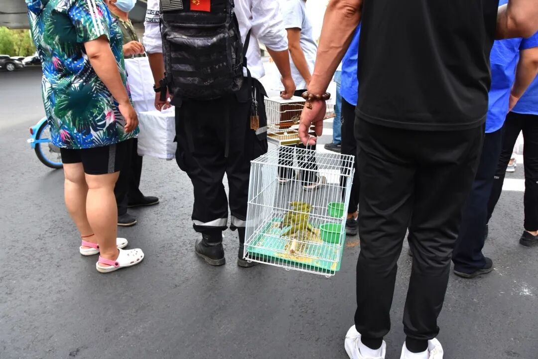 在劝阻了一段时间后,执法人员和志愿者拿着收缴的20余只鸟儿开始离开鸟市,前往老万柳塘鸟市附近放飞。