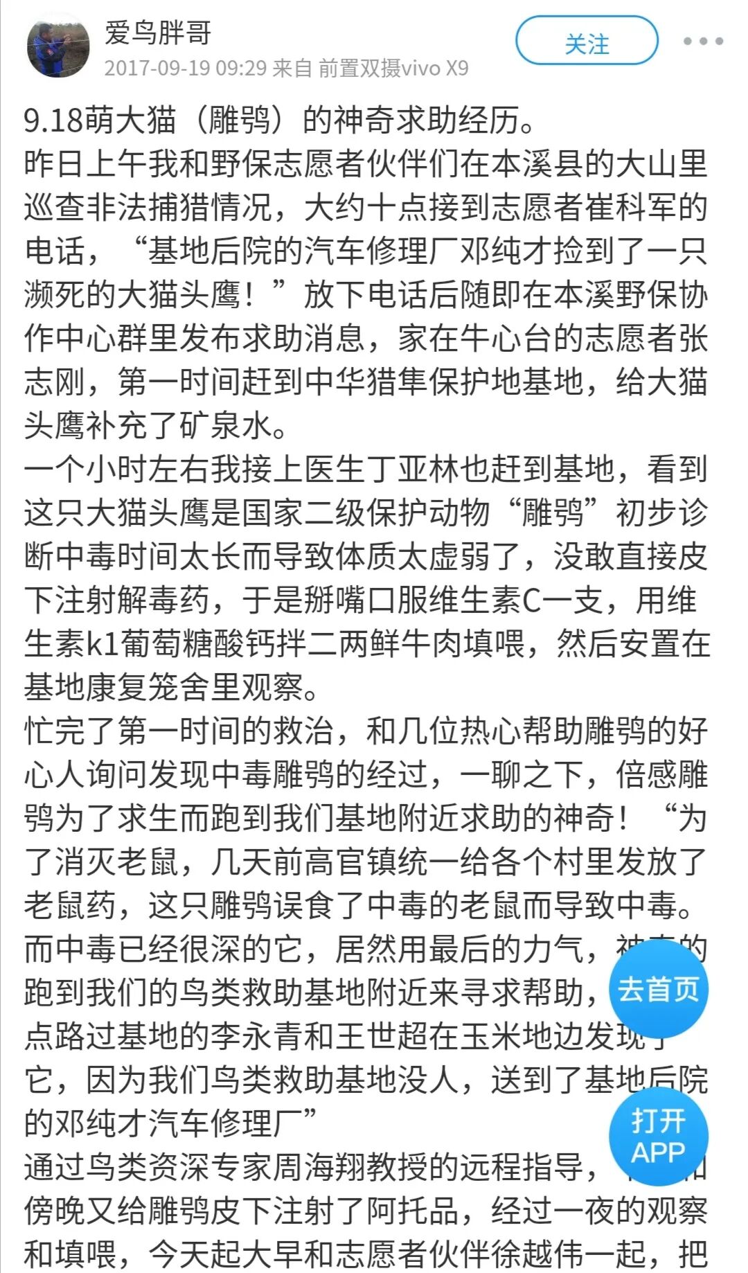 如果发现异常了,曹大宇就会召集更多的志愿者分区域来寻找雕鸮,如果中毒了或者身体出现不健康的情况,在周边就会找到它,然后尽快开展治疗。