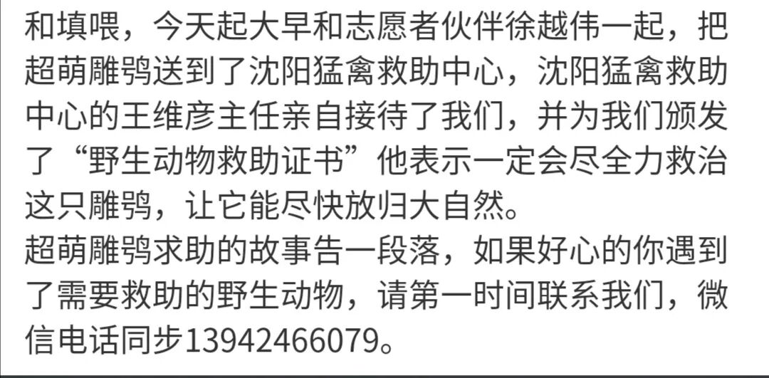 东北野战军此前救助过好多只雕鸮。以前的救助基地,曾有一只受伤的雕鸮,吃了老鼠药,自己跑到救助站,房东看到就打电话给曹大宇,但那会救助猛禽的经验不多,就辗转送到另一个救助站去了。