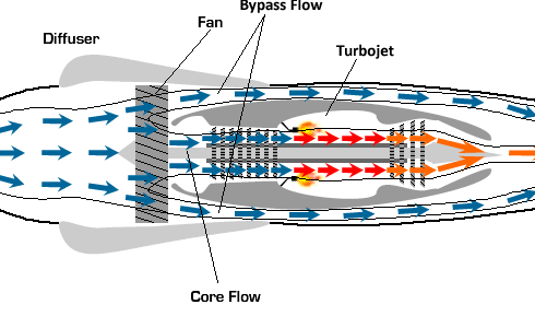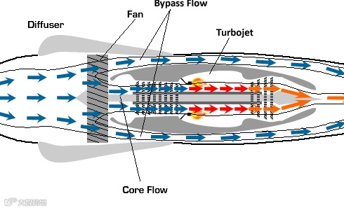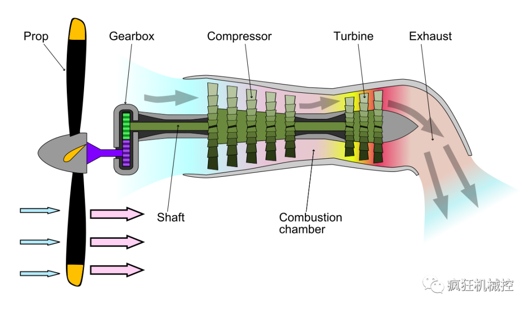 涡轮螺旋桨发动机的螺旋桨后的空气流就相当于涡轮风扇发动机的外涵道,由于螺旋桨的直径比发动机大很多,气流量也远大于内涵道,因此这种发动机实际上相当于一台超大涵道比的涡轮风扇发动机。