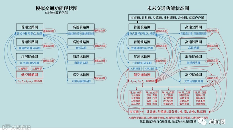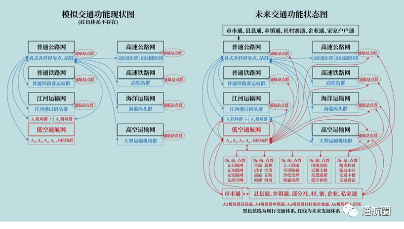 在三维立体交通运输体系中,“低空通航短途交通运输网”是深入县、乡、镇、社、村、寨、企业和个人的毛细血管体系,“高空航空运输网”则是远程交通大动脉体系。