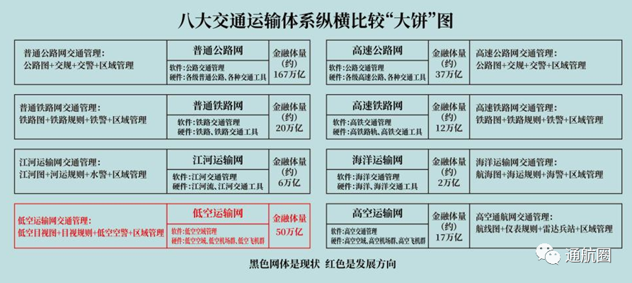 极客:“通航产业的万亿蓝海”要先明确“通航市场的体量”,咱们用“横向比较法”来试着展望我国经济未来几十年的发展,对比国家在七大交通运输体系(通航大咖说 | 八大交通运输体系探析——“通航极客”谈通航事业系列③)里面各投入了多少,市场体量是多大,这样来回比较之后,就会估算出如何在30年的时间,通用航空产业、产业链生态发展从现在的“零”一直发展到未来“50万亿汪洋体量”的。