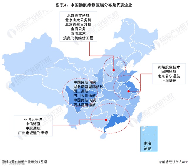中国通用航空维修单位分布呈现出明显的地区性,集群效应初步显现,西南、华东、华南、华北地区通航维修企业分布较多。西南地区的代表维修企业包括中国民航飞院、湖北蔚蓝国际航校等;华南地区的代表维修企业包括亚飞太平洋、中信海直等;华东地区的代表维修企业包括燕翔航空技术、国网通航等;华北地区的企业主要包括北京鼎实通航、北京山太公务机等。具体分布区域如下: