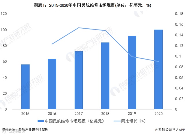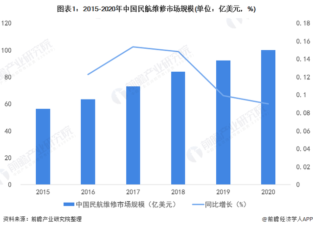 中国民航维修行业规模发展迅速,维修项目基本齐全。随着中国航空运输业蓬勃发展,中国已成为全球增长最快的民航维修市场。2015-2019年,中国民航维修市场规模波动上升。2019年中国航空维修市场规模达到92亿美元左右,同比增长9.9%,2020年中国航空维修市场规模达到100亿。