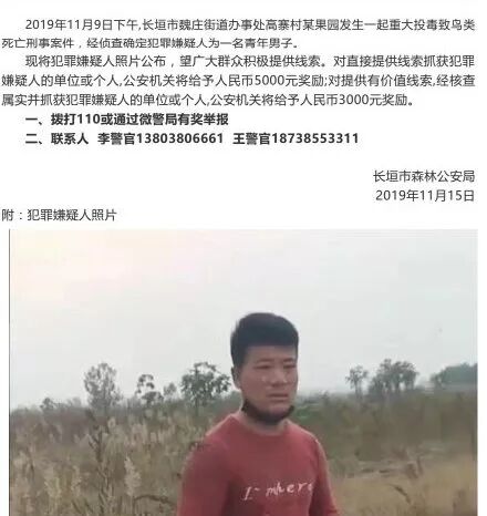 2、11月9日下午,黄河大鸨守护者团队和兄弟志愿者团队,巡护时在河南长垣市魏庄街道办事处高寨村某果园发现一起重大投毒致鸟类死亡刑事案件,现场发现数百只遭毒杀的麻雀、斑鸠等野鸟,经侦查确定犯罪嫌疑人为一名青年男子。目前,长垣市森林公安局已发布悬赏通告,并将犯罪嫌疑人照片公布。据介绍,麻雀、斑鸠属于“三有”保护动物,狩猎二十只以上属于情节严重,可处三年以下有期徒刑、拘役、管制或者罚金。