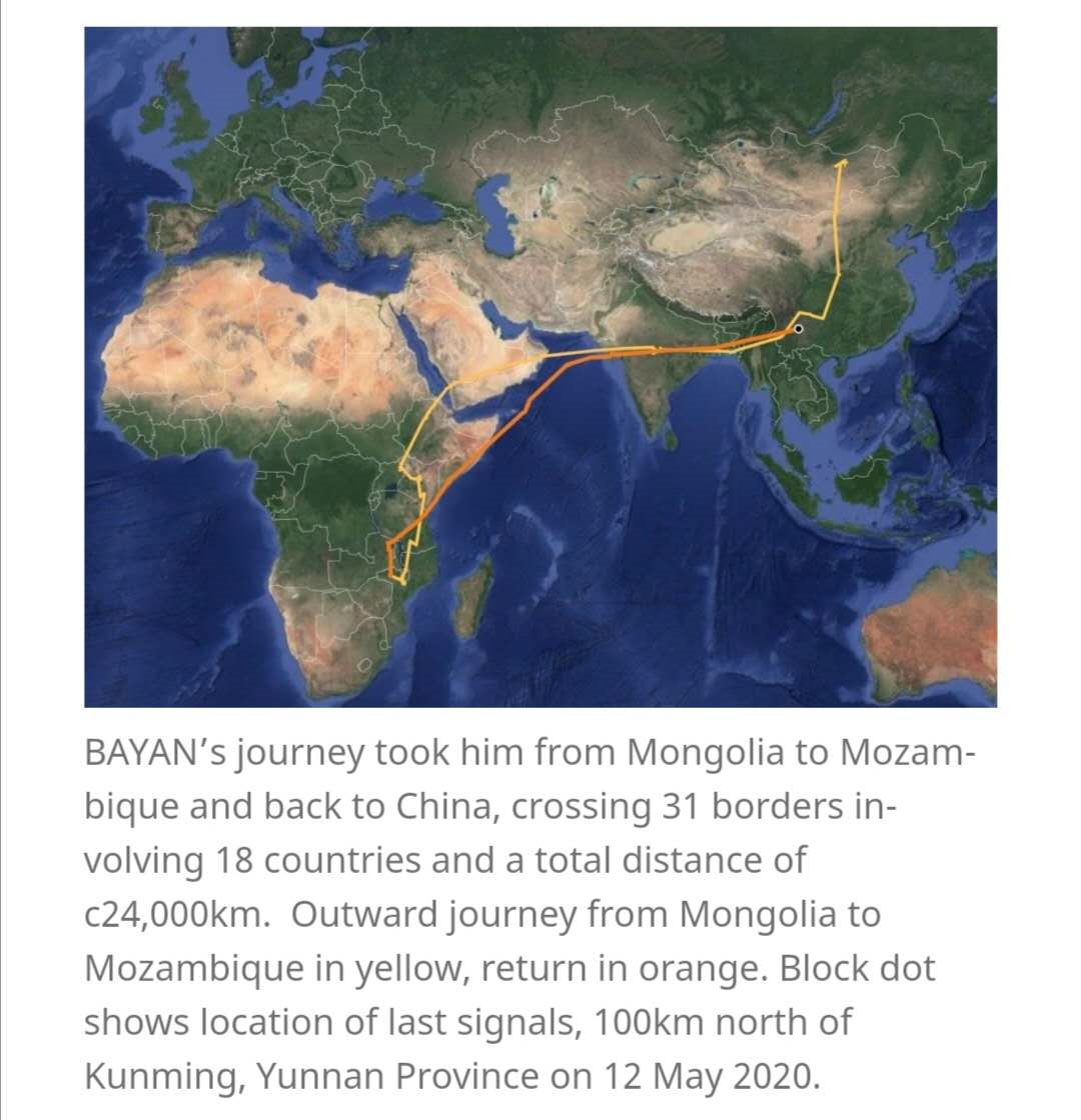 我们的担忧不是不无根据,最近我们于“Birding Beijing”上得知,在蒙古国被填装定位器的杜鹃BAYAN在从遥远的非洲回迁途中失去信号,最后的信号发射地点为云南昆明北部100km左右。具专业人员分析,这样的情况表示,BAYAN已经遭遇不测。