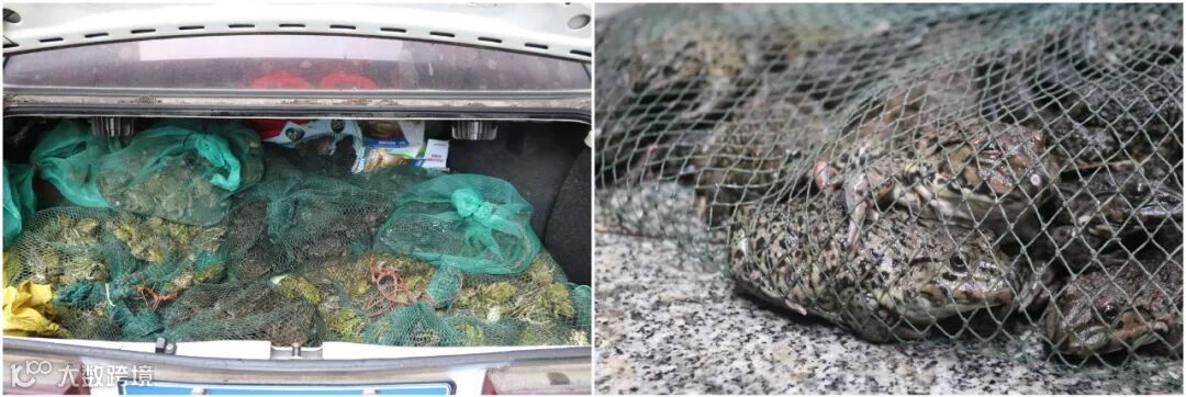 图为2019年5月18日,野保志愿者举报江西省九江市江洲农贸市场滥卖野生蛙类,相关部门查获该市场14家商铺卖普通野生青蛙,5家商铺卖国家二级保护动物虎纹蛙。2019年5月-6月间,懿丹野保团队举报贩卖虎纹蛙的摊贩11起,地点包含江西乐平、江西湖口、江西上饶、江西鹰潭、浙江衢州、湖北通城、安徽安庆、安徽宿松、湖北黄梅、江苏南京。数量至少上百只,但因有的地方称重,有的地方计个数,总数无法统计。