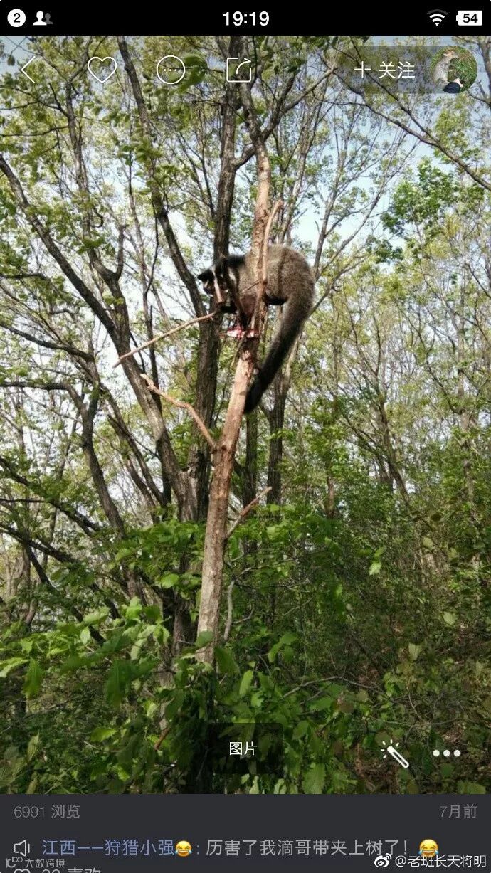 2018年1月民间团体@反盗猎重案组举报一个盗猎嫌疑人多次发布盗猎信息,图为带着夹子的果子狸爬上了树。2017年至今,@反盗猎重案组 举报网络盗猎信息有多条包括果子狸。这仅仅是盗猎分子主动晒出的,现实中很可能远多于网络。
