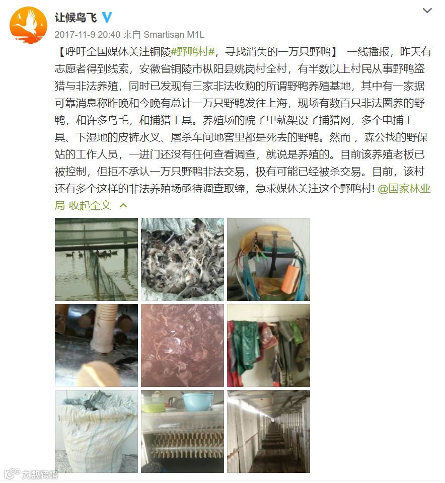 2017年11月,志愿者在安徽铜陵“野鸭村”姚岗村,发现多个存在非法捕猎和收购的野鸭养殖基地,举报后森林公安办案消极,举报过程艰难。