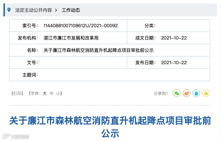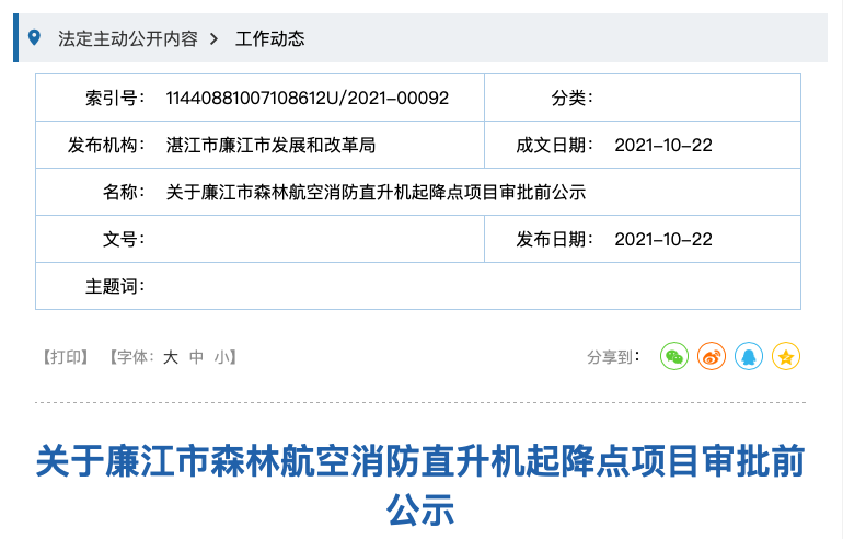 日前,广东湛江廉江市发展和改革局发布《关于廉江市森林航空消防直升机起降点项目审批前公示》。