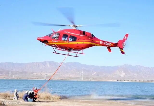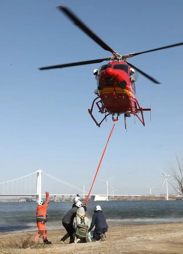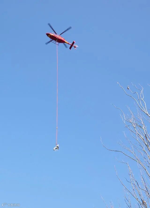 ↑直升机准备将电力工人吊挂升空并前往线路缺陷现场。